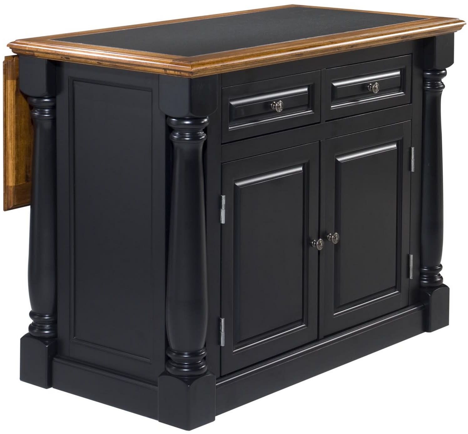 This Monarch Kitchen Island by homestyles blends upscale design with state-of-the-art functionality. Stylish design features include a solid hardwood top with distressed oak finish and profiled edges, a black granite inset, framed side and back panels in a black finish, and brushed nickel hardware. Functional elements include two storage drawers and a two-door storage cabinet with four adjustable shelves. A patented hidden sliding mechanism connects the back two posts, providing easy mobility when expanding the breakfast bar from 25" to 40.5".